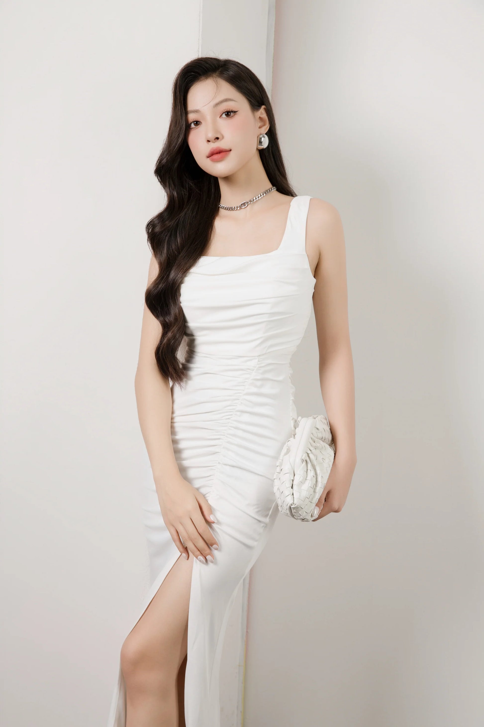 A piece with ruched details and a thigh slit, it is also a body hugging piece that elevates your body shape. Item comes in 2 colours, black and white.