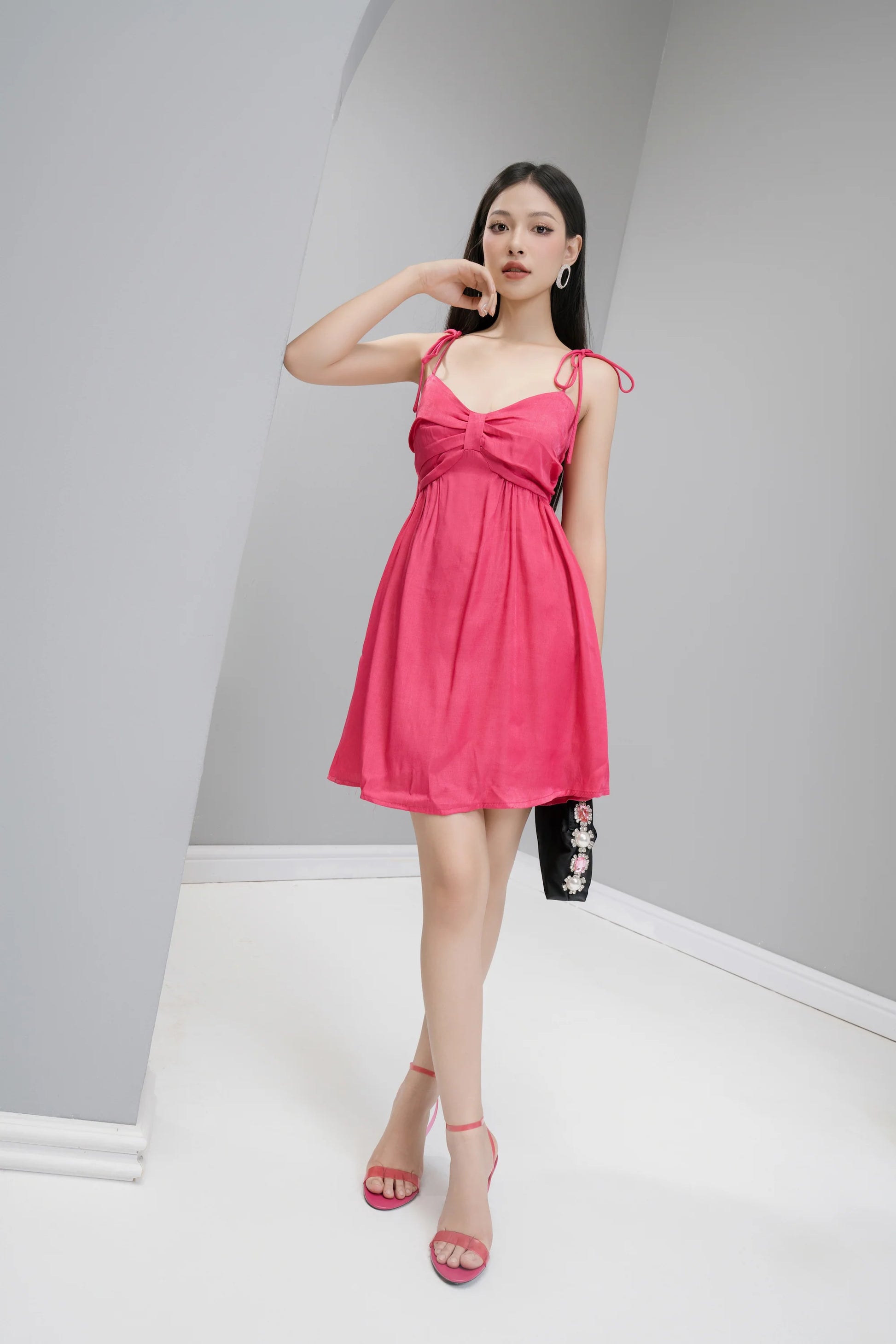 A dainty dress perfect for any occasion with a bow front design and tied string straps. This colourway adds a pop of colour and is available in white too.