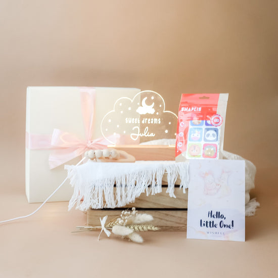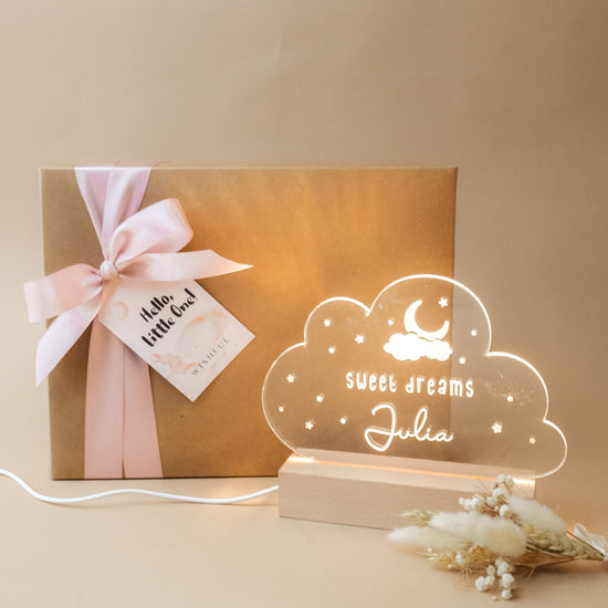 Children deserve all the love in the world. Congratulate your loved ones on their new baby or gift a lovely child with one of these sweet personalised gift sets! Complimentary name engraving on the Night Lamp that makes the child feel loved, unique and special.