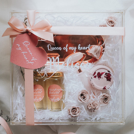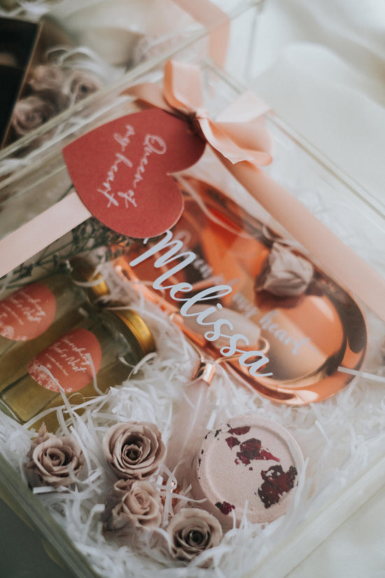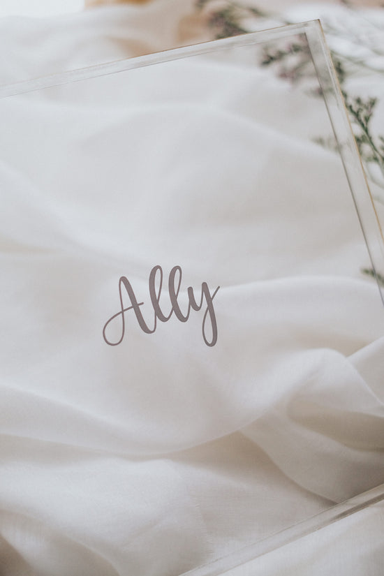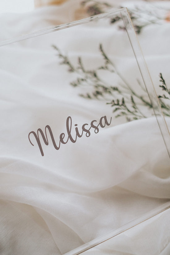 1x Reusable Acrylic Box with Personalised Name Decal, Adorned with Preserved Florals, Ribbons and Gift Tag