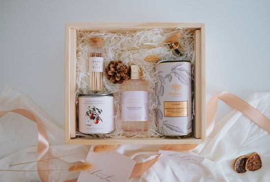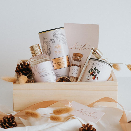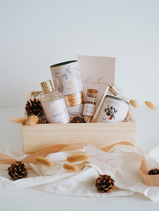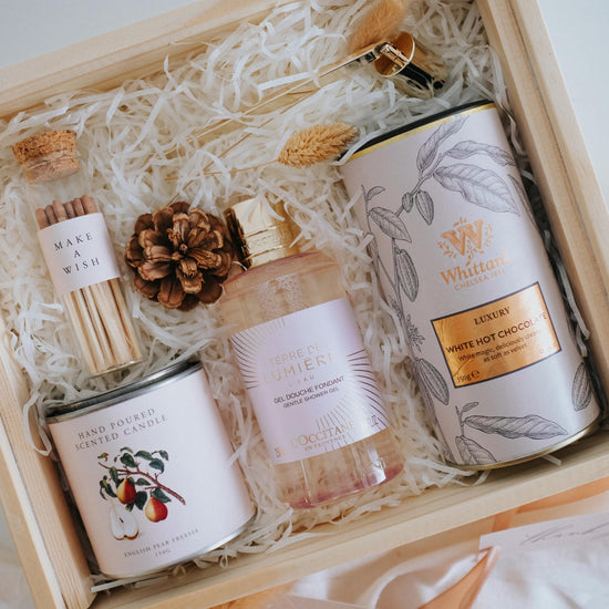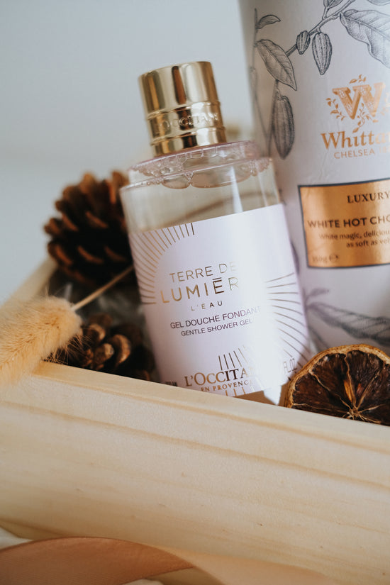 This gift box is designed for a full pampering experience. Think a cozy evening of winding down with a cuppa luxurious white hot chocolate accompanied by the comforting scents of English Pear & Freesia, right after stepping out of a relaxing warm bath with the invigorating Terre de Lumière.