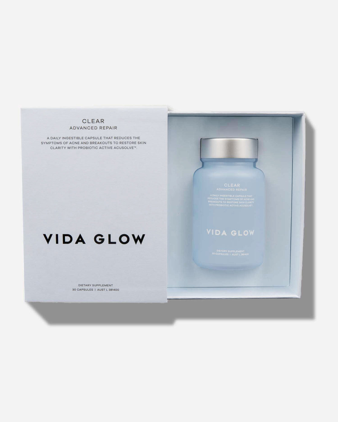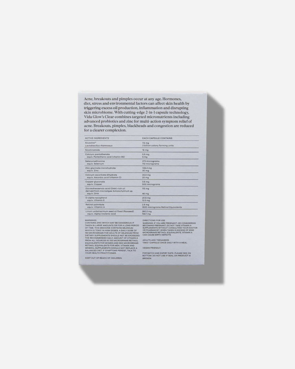 Clear 是 Vida Glow 高级修复系列的每日一次服用胶囊。痤疮、痘痘和粉刺发生在任何年龄。然而,激素、饮食、压力和生活方式因素会损害皮肤健康并破坏皮肤微生物群。 Clear 能够对抗痤疮的主要症状,包括粉刺、黑头、油脂过多和皮肤炎症,可全身性地减少痘痘、治愈皮肤并恢复透明感。并将痤疮症状减少 50%。
